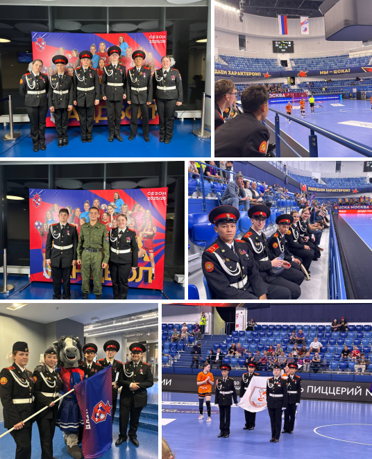 Кадетам 9 «К» и 11 «К» классов выпала высокая честь — участие в торжественной церемонии выноса флагов перед началом гандбольного матча между командами ЦСКА и «Уфа-Алиса».